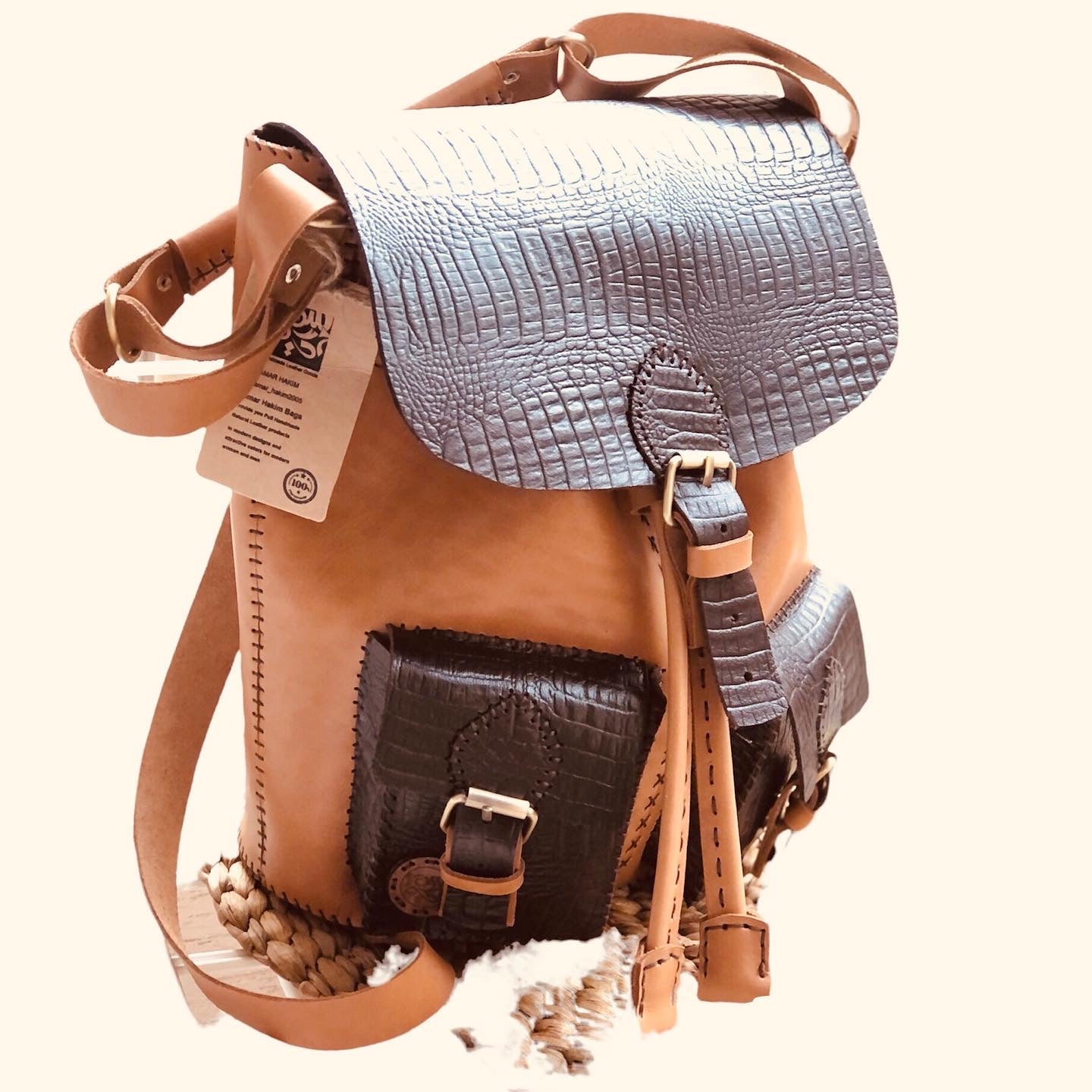 This special edition of the ARTICULA Backpack by Samar Hakim combines classic softness with bold texture. Crafted from a mix of smooth camel brown leather and dark brown croco-embossed leather, this backpack reflects artistry, comfort, and confidence in every detail.