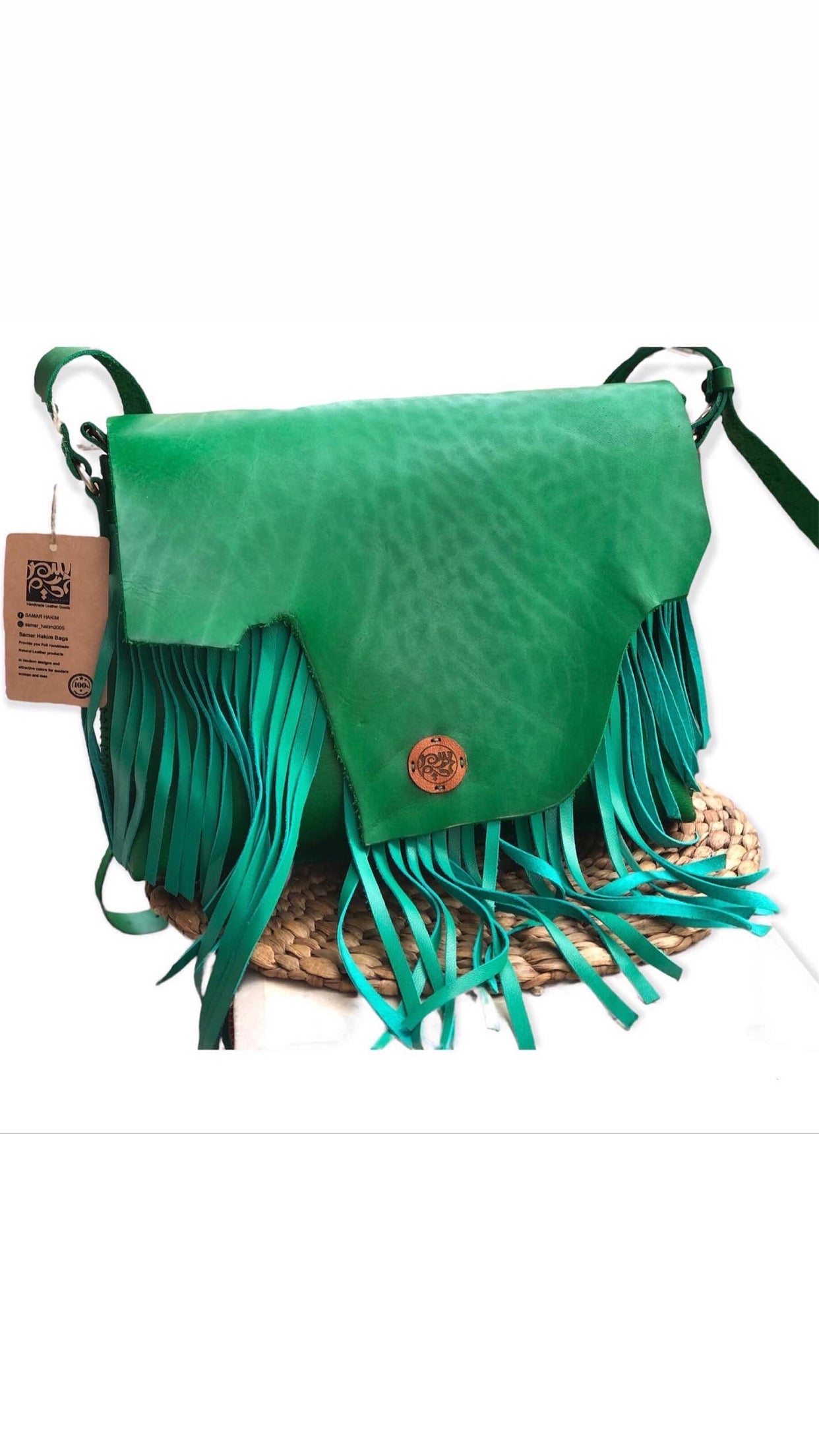 One-piece crossbody bag handcrafted from a blend of natural cow and goat leather. The leather is soft to the touch and beautifully shaped into handmade fringe details, offering a unique bohemian look. Each bag is fully handmade by skilled artisans with no machine cuts – just authentic craftsmanship.