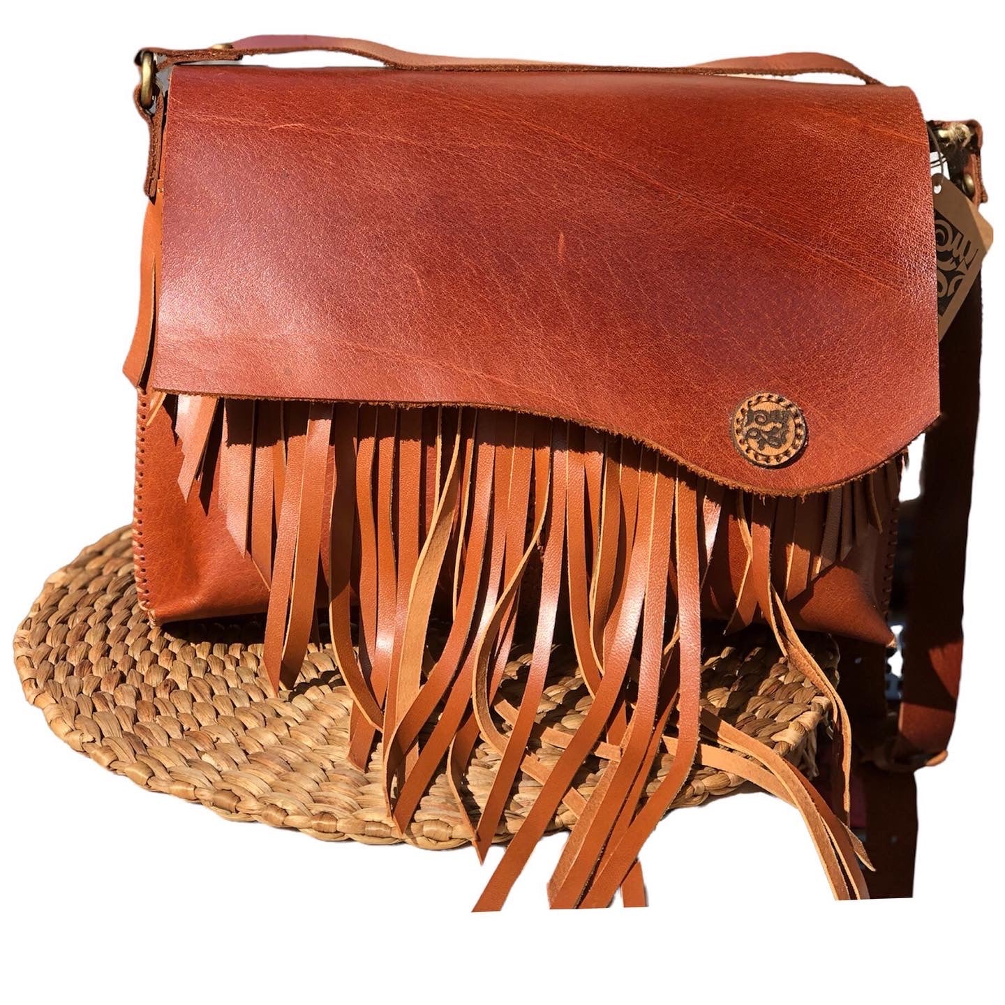 One-piece crossbody bag handcrafted from a blend of natural cow and goat leather. The leather is soft to the touch and beautifully shaped into handmade fringe details, offering a unique bohemian look. Each bag is fully handmade by skilled artisans with no machine cuts – just authentic craftsmanship.