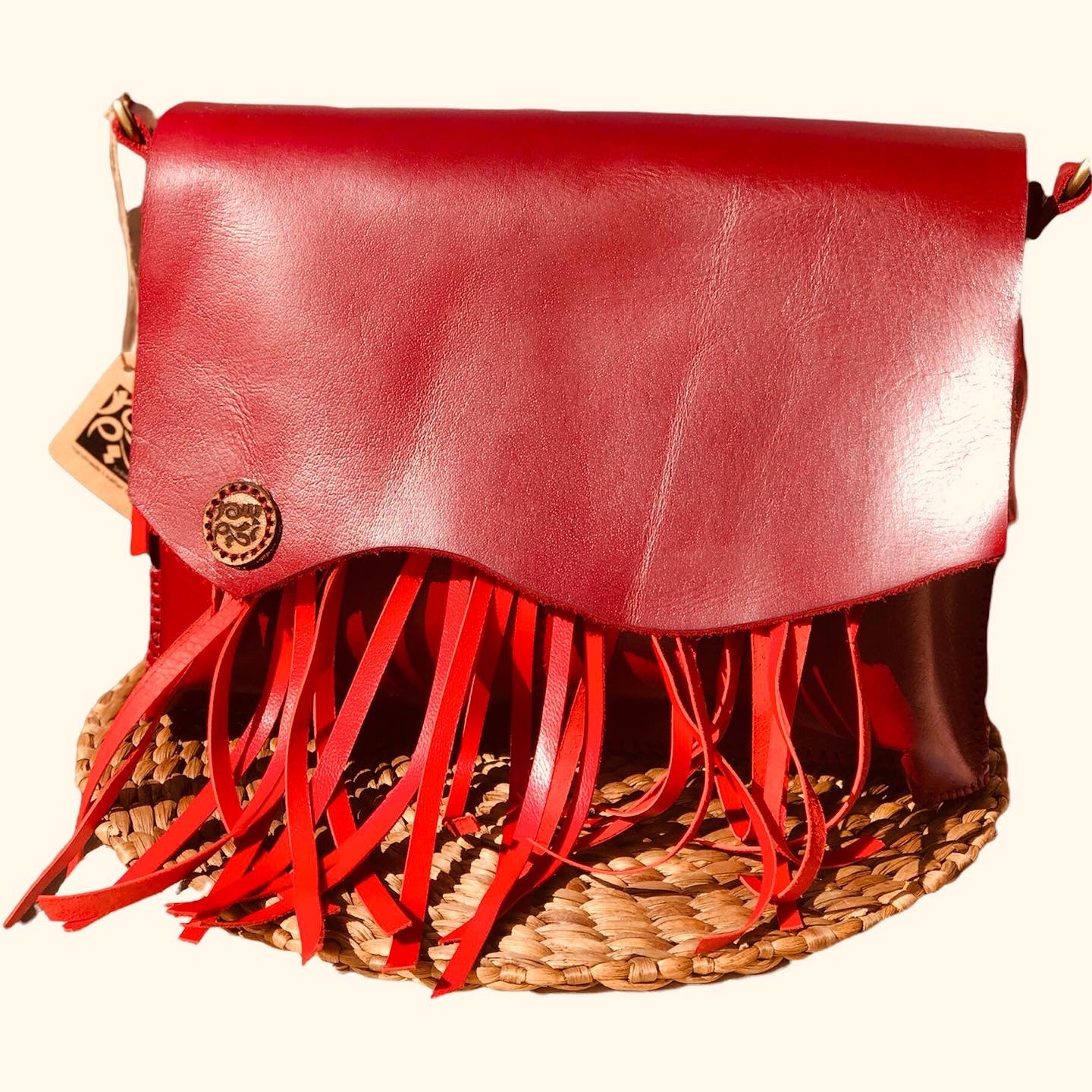 One-piece crossbody bag handcrafted from a blend of natural cow and goat leather. The leather is soft to the touch and beautifully shaped into handmade fringe details, offering a unique bohemian look. Each bag is fully handmade by skilled artisans with no machine cuts – just authentic craftsmanship.